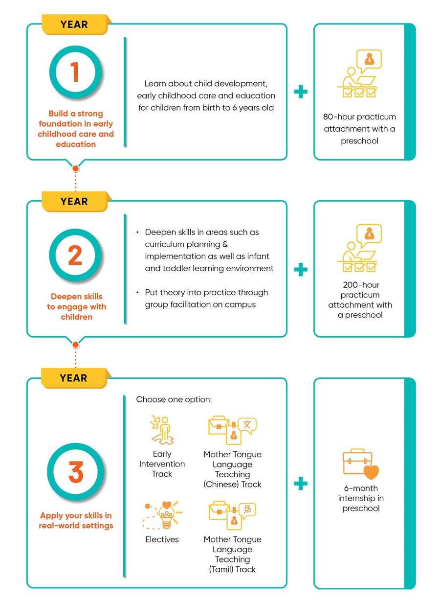 - Expand your career options by pursuing either the Early Intervention Specialisation or Mother Tongue Language Teaching Specialisation (Chinese or Tamil) when you take up relevant electives*