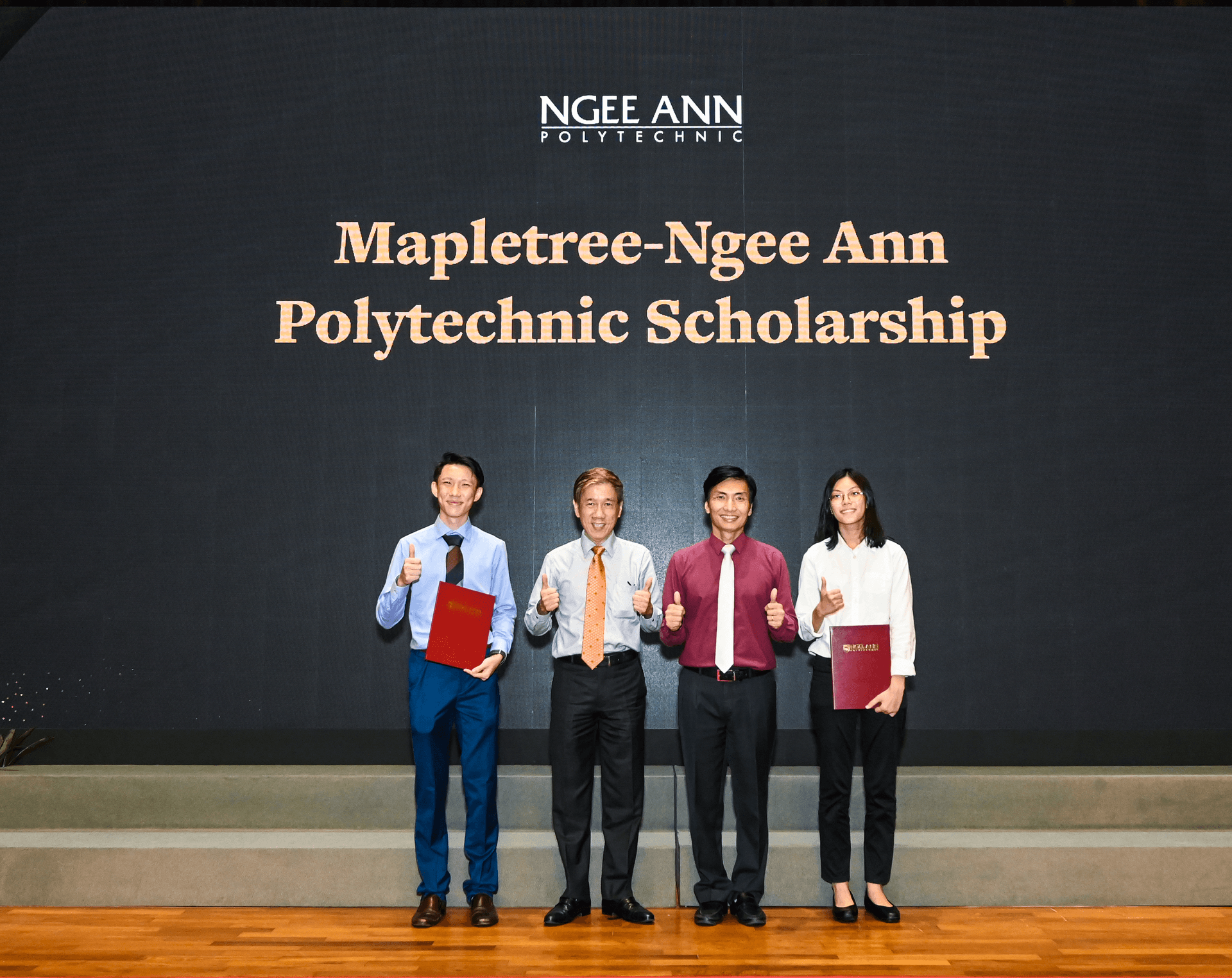 Second-year Real Estate Business (REB) students Ethan Tan Yee Binn (far left) and See Wei Shan (far right) were recipients of the Mapletree-Ngee Ann Polytechnic Scholarship.