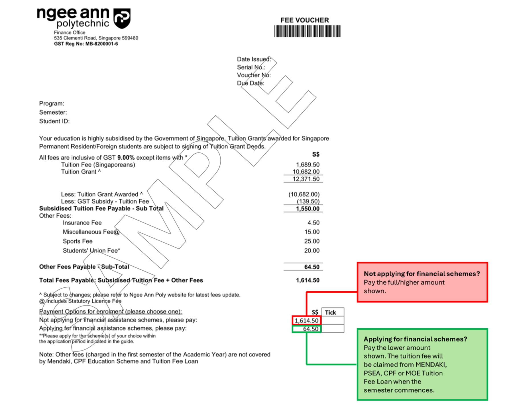 Check your NP connect email between March to April for information on how to apply for financial schemes (PSEA, Mendaki, CPF or MOE Tuition Fee Loan).