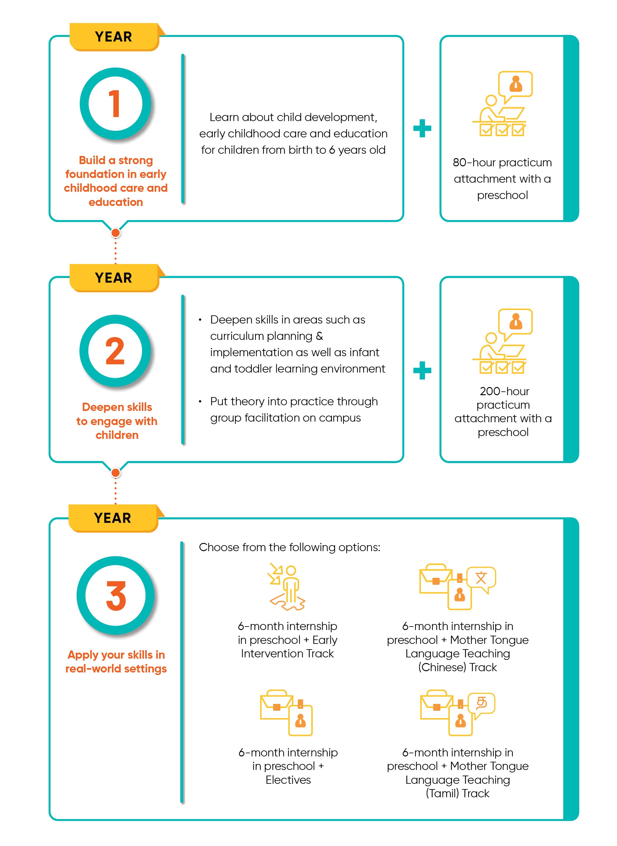 - Expand your career options by pursuing either the Early Intervention Specialisation or Mother Tongue Language Teaching Specialisation (Chinese or Tamil) when you take up relevant electives*