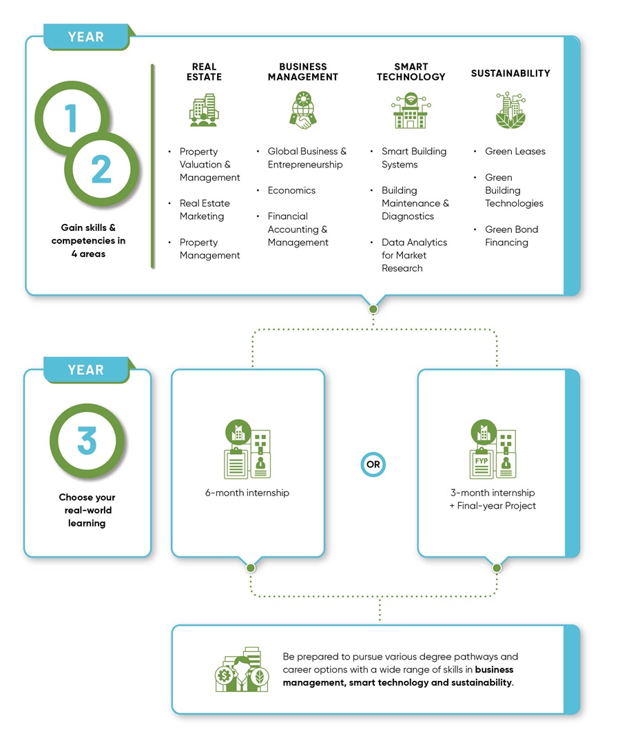 This module helps to introduce students to their three-year diploma course curriculum; the real estate industries and how they can prepare themselves to meet the industries requirements and needs. Through the module, students will be required to explore, grow and reflect on how they can serve in these industries. This module is also designed holistically for the contribution towards the overall well-being of the society as we prepare our students to succeed in their careers by helping the students to transcend and link their academic studies to skills and character development. The module will take a student-centric approach to introduce multiple pathways to develop students of different abilities to their fullest potential during and after obtaining their diploma. The pathways include industry partnerships and students’ participation through SkillsFuture initiatives. Through the module, students should be able to embark on their course with the end in mind after guided reflection of their personal characteristics, and producing an overall game plan for their future education and career goals. The module also aims to deepen students’ commitment to the real estate sectors.