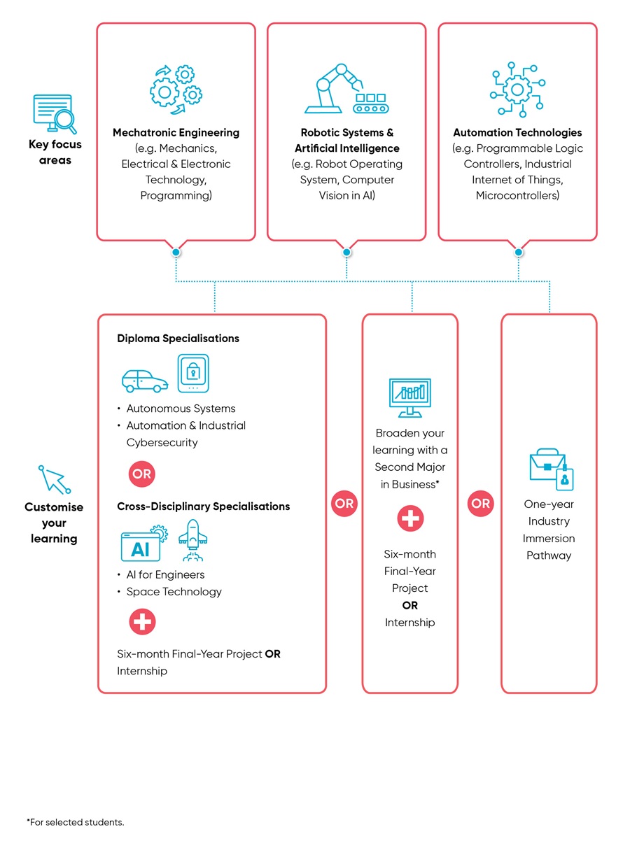 Robots are changing our daily lives – imagine stepping out of your smart home, taking a self-driving vehicle to your favourite restaurant, and getting served by a robot waiter! The field of robotics and automation is steadily growing and finding its way into every home, company and industry. If you want to engineer the next generation of robots and smart machines, the Diploma in Mechatronics & Robotics (MR) is your ideal choice.With our broad-based curriculum, you will learn to use emerging technologies in robotics and automation, such as augmented reality, computer vision and Industrial Internet of Things, to develop high-tech solutions for consumer products and industrial applications. This will give you an edge when you pursue exciting careers in growing fields such as service robotics, autonomous driving technologies and industrial automation and applications.