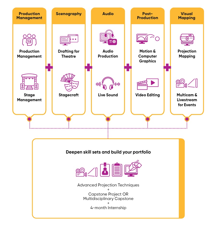 - Specialise in technical theatre and live events — from stagecraft and stage management to projection mapping — to produce creative works for stage, events, and immersive experiences.